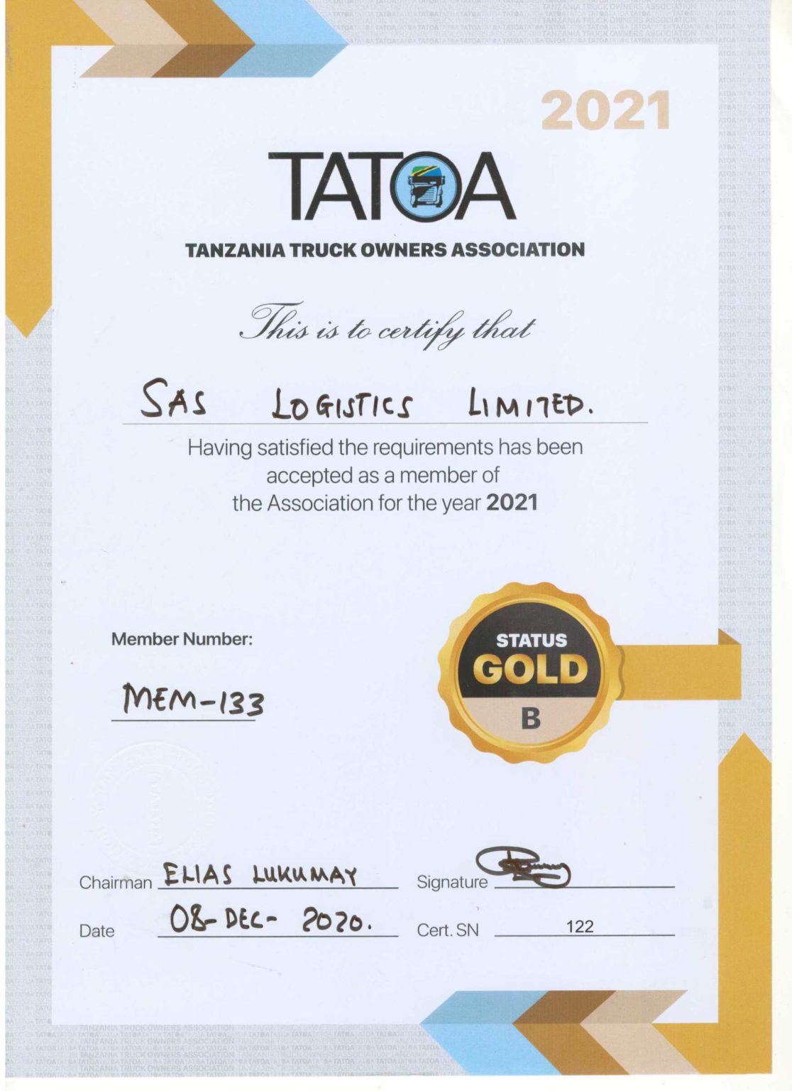 TATOA member Certificate