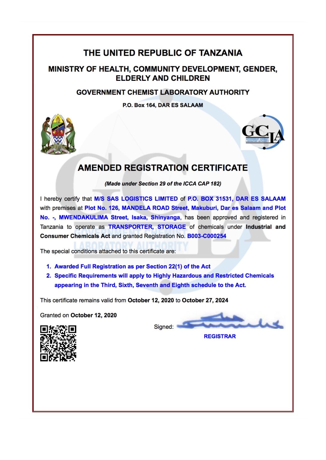 Certificate of Registration from GCLA