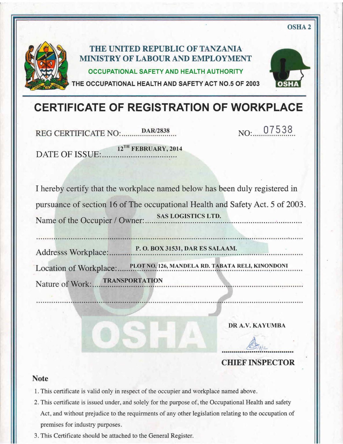 OSHA Certificate of Registration